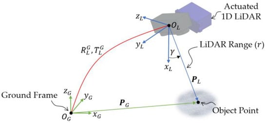 The collected ranges from the 1D LiDAR along the flight path are converted to the ground coordinate frame, , as shown in Figure 3. This process involves defining the LiDAR ranges, , in the 3D coordinates system of the LiDAR coordinate frame, , using the servo motor angles, , as follows: