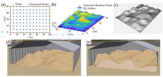 (a) Uniformly distributed points within the storage space used for stockpile modelling. (b) The 3D surface is generated by fitting a surface over the predefined points. (c) The STL 3D model file developed from (b). (d) The simulation environment showing the storage and the “first” stockpile originated from the STL file in (c); the front wall is removed to show the inside of the storage. (e) The simulation environment with the “second” stockpile that has more materials near the walls.