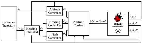 The overall block diagram of the drone control system is illustrated in Figure 6. The drone positions (), orientations (), and angular speeds () are obtained directly from the simulation. The objective of the altitude controller was to minimize the error in the altitude, , by satisfying the following condition: