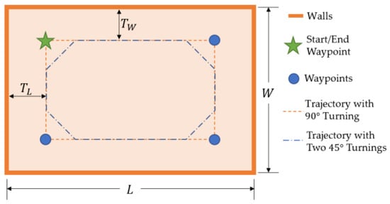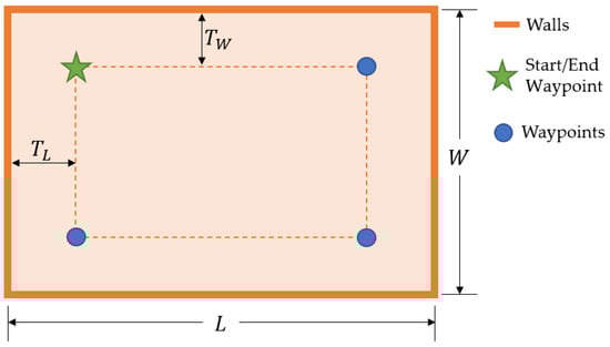In the current study, the storage spaces were depicted as rectangular. While this was decided to allow more simplicity to the investigation, the rectangular shape is indeed the most common configuration in most industrial plants. Given the storage planform rectangular shape, it was decided that the desired drone trajectory for the mapping mission would also follow a rectangular shape. As such, the trajectory was determined by four waypoints distributed close to the storage corners, as shown in Figure 7. The parameters and in Figure 7 are the storage length and width, respectively. Moreover, the parameters and were defined as follows:
