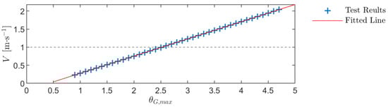 Relationship between drone flight speed, , and maximum pitching gain, . From the fitted line, the desired drone speed ( m·s−1) can be reached when .