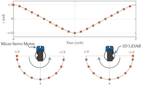 The proposed actuated 1D LiDAR system was attached to the drone while employing a servo motor and a 1D LiDAR sensor from the simulation libraries. The servo motor is a rotational motor with a position sensor. The motor properties, such as its maximum velocity and minimum and maximum positions, can be adjusted to achieve the motion profiles described in Section 2.2.