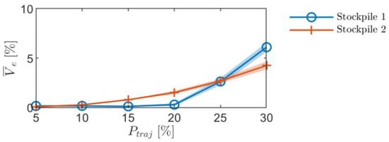 Stockpile mean volumetric error, , of both stockpiles versus the trajectory waypoints allocation percentage, , under baseline simulation conditions. The solid lines represent the mean volumetric error, and the shaded regions represent the standard deviation, due to testing at different initial positions of the servo motor.