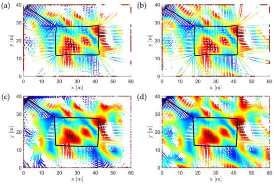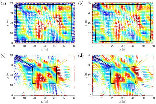 The projected scan on the XY-plane for stockpiles 1 and 2. (a,b) Results for the minimum tested value of 5% for stockpile 1 and 2, respectively, and (c,d) results for the maximum tested value of 30%. The scattered data is the point cloud, , and the colors encode height from the ground. The black line is the recorded flight trajectory.