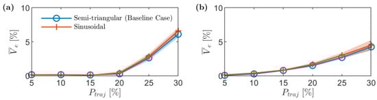 Stockpile mean volumetric error, , against the waypoints allocation percentage, , for different oscillation motion waveforms of the servo motor; (a) stockpile 1 and (b) stockpile 2.