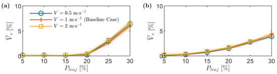 Stockpile mean volumetric error, , against the waypoints allocation percentage, , for different flight speeds. (a) Stockpile 1 and (b) stockpile 2.