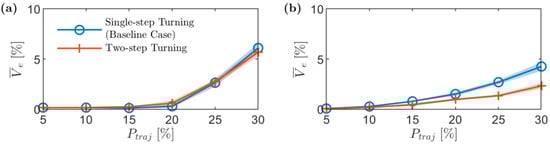 Stockpile mean volumetric error, , against the waypoints allocation percentage, , for different turning approaches at the corners. (a) Stockpile 1 and (b) stockpile 2.