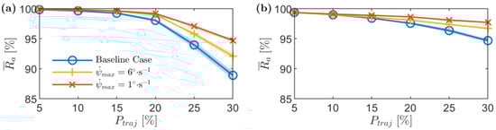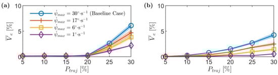 Stockpile mean volumetric errors, , against the waypoints allocation percentage, , for different yawing speeds. (a) Stockpile 1 and (b) stockpile 2.