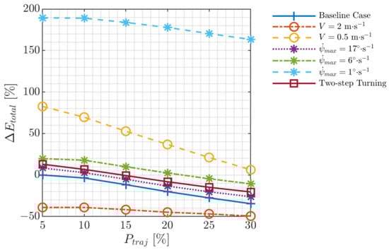 A possible way to enhance the coverage of scanning and reduce blind spot areas, particularly at corners, is by modifying the way the drone turns to a “two-step” turning fashion. This two-step turning, as illustrated in Figure 15, is proposed so that instead of turning to the next waypoint in one 90° step, the drone turns in two-steps each at 45°. Figure 16 shows the volumetric error for the baseline testcase results and that from adopting the two-step turning approach. Generally, the trajectory with the two-step turning at the corners enhances the volumetric error values but with different impact on the two stockpiles. For stockpile 1, the value of was only marginally enhanced at the maximum case from 6.1% to 5.7%. However, for stockpile 2, the value of improved for almost all cases, as the average value of reduced from 1.6% to 0.9%, and the maximum value for reduced from 4.3% to 2.3% at the maximum case.