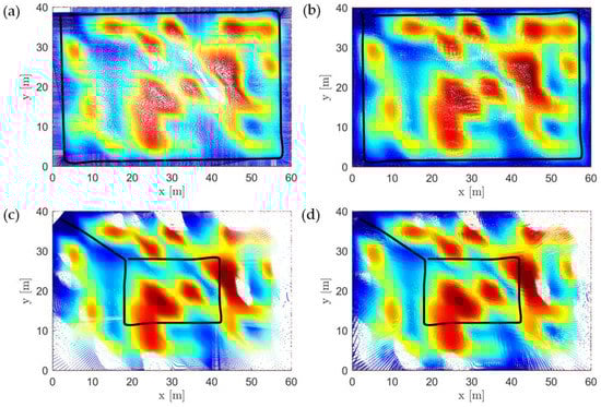 Generally, increases with mainly because as increases, the total flight distance decreases, as shown in Figure 12. This reduction in the flight distance can lead to blind spots, i.e., spots where the LiDAR cannot capture sufficient data. Figure 12 shows the projected scans on the XY-plane, where it can be seen from Figure 12c,d that blind spots (white regions in the figure) are more significant at maximum and are mostly at the corners (recall the LiDAR scanning plane is perpendicular to the flight line). The reduction in the scanned area (or presence of more blind spots) can be assessed using the proposed projected reconstructed area ratio, , defined in Section 2.5. As increases from 5% to 30%, the mean value of reduces from ≈100% to 89% for stockpile 1 and from ≈100% to 95% for stockpile 2.