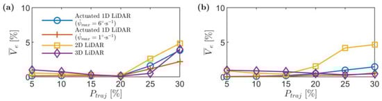 Mean stockpile volumetric error, versus the trajectory waypoints allocation percentage, with sensors’ noise effect (blue line) for (a) stockpile 1 and (b) stockpile 2. The solid lines represent the mean volumetric error, and the shaded regions represent the standard deviation.