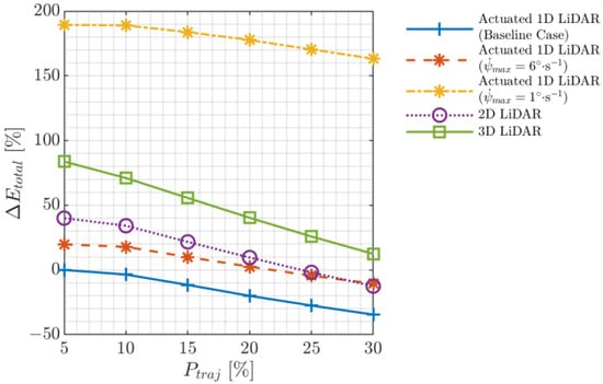 In the baseline testcase simulations, the desired flight speed, , was always set to 1.0 m·s−1, as shown in Table 1. Now, the influence of changing the flight speed is investigated to assess how changing the time duration allowed for scanning along a given trajectory would influence the reconstruction quality. Figure 14 shows the results of this investigation where it is evident that flying at different speeds has no clear impact on enhancing the volume error for both stockpiles. However, it must be stressed that flying indoors at relatively higher speeds, such as the 2 m·s−1 in this demonstration, is not recommended from a flight safety perspective. On the other hand, when taking into account energy budget considerations, flying at a lower speed, such as the 0.5 m·s−1 in this demonstration, leads to more energy consumption, as will be shown later in Section 4.3. Hence, on balance, it seems that the baseline testcase flight speed of 1 m·s−1 is the most convenient choice.