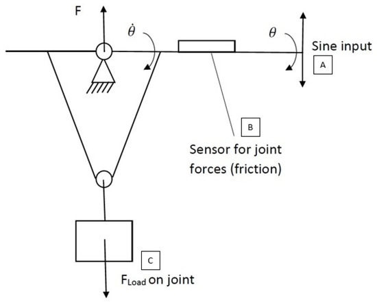 The next component is the loading, which is distributed across either side of the joint (C). This loading can be achieved either using masses or through direct application of force as long as the magnitude is accurately quantifiable and controllable. This loading is what will generate the friction force in the joint that the testing apparatus will be measuring. It is imperative that the measurement system does not add to the complexity.