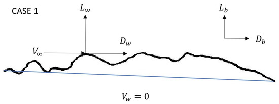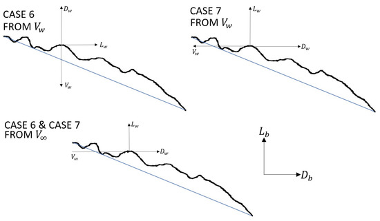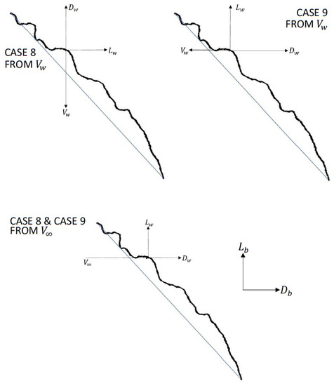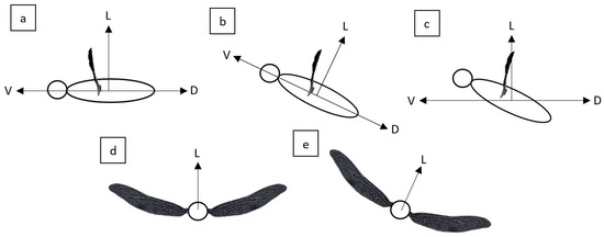In these equations, the plus-minus is used because the lift and drag forces generated by wing movement and body movement can either augment or detract from one another depending on the wing orientation, as shown in Section 3.3.1. This section also shows why lift and drag expressions are combined for Equations (35) and (36).