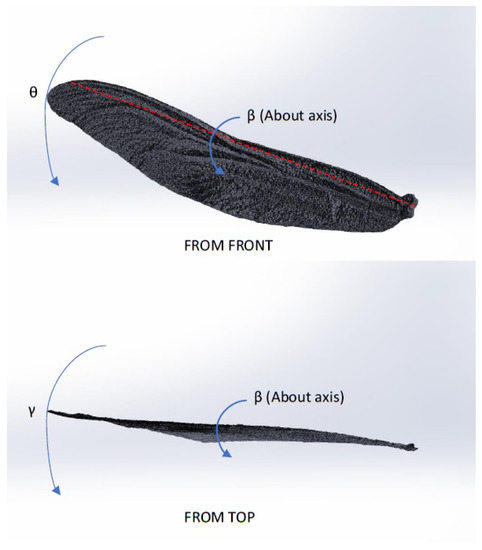 This necessitates being able to transform the forces acting upon the wing’s coordinate frame to that of the body’s coordinate frame to be able to determine the net forces acting upon the craft. To start with, every force acting on the wings (all of which are explained in more detail in Section 3) will generate loading that does not conform to a single axis; as such, the three directional forces on each wing can be expressed along the three axes to yield , and , respectively. Adding these vectors would yield the net force for a particular wing.