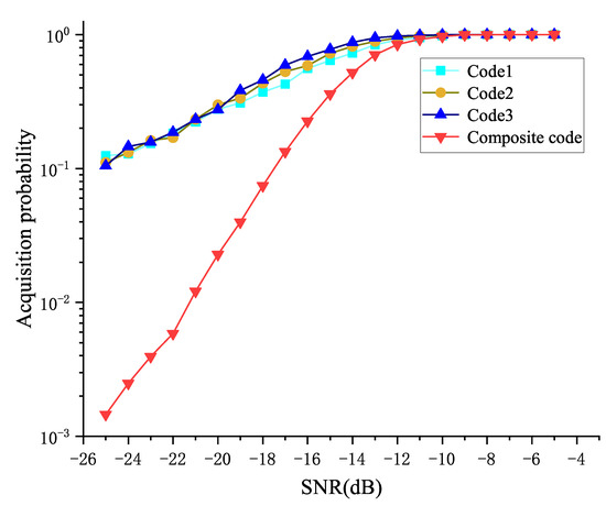 Figure 6, the acquisition probabilities of the three ranging codes are not consistent. However, the receiver needs to successfully acquire each ranging code to correctly range the transmission distance. Therefore, the overall acquisition performance can more directly reflect the actual SNR requirement of the system.