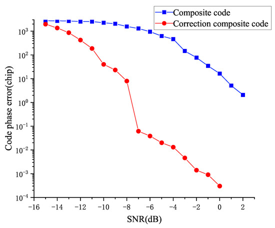 Figure 8, before self-correction, the receiver can only correctly calculate the composite code slice offset when the three ranging codes have been totally tracked. Moreover, the error of the calculated composite code slice offset is larger than the phase error of a single channel ranging code. After the self-correction of the tracking results, the system can correctly range the measured distance when the SNR is above 0 dB. Compared with the SNR requirement for stable tracking of a single channel ranging code, the SNR requirement for correct measurement of transmission distance is reduced by 2 dB. Moreover, the error at low SNR is also greatly reduced.