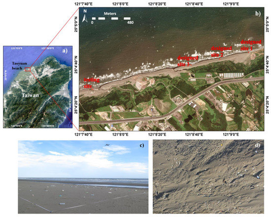 In this study, we conducted four cohesionless extents on a sandy beach of Taoyuan. We set up case study areas with a range of 10 m by 15 m, consisting of three designed sites (25°4′44.60′′ N, 121°9′8.84′′ E; 25°4′41.34′′ N, 121° 8′53.21′′ E; 25° 4′38.60′′ N, 121° 8′37.57′′ E) and a testing site (25° 4′27.12′′ N, 121°7′44.76′′ E). Figure 1a shows the geographic locations of the sector of Taoyuan beach, and Figure 1b shows a detailed map with the sites marked as small red rectangles. Figure 1c shows a closed-sight view at designed site 1. The testing site (Figure 1d) near the landfill area of Taoyuan City was used to judge our method on such a complex sandy beach. We surveyed a supratidal zone and neglected the intertidal zone because marine debris in the intertidal zone was dominated by sizes ranging from 0.2 cm to 2 cm [23], while this research only considered BMD as mentioned.