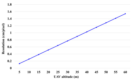 where SW is the sensor width, FH is the flight height, FL is the focal length of the camera, and IW is the image width [14,27]. Hence, the image resolutions were from 0.12 to 1.54 cm/pixel. The image resolution changed with the flight altitude, as shown in Figure 2.