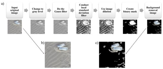Process of background removal. (a) Flow chart of the procedure; (b) example of the original image. (c) Example of the background removal image.