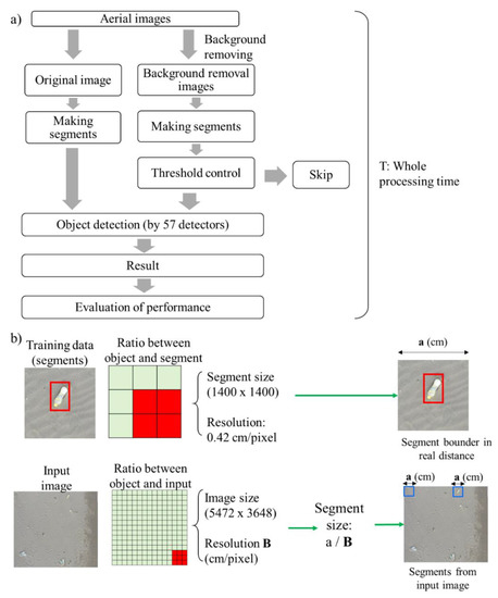 This study performed three stages of analysis to examine for both original or background removal images: (1) it was divided into segments; (2) the detection was performed via 57 detectors; and (3) validated with reference data (Figure 5a). To ensure the resolution between the training data and the input image were the same, the segment size was first calculated according to the correlation between the actual border range of the training data and the segment’s resolution B (Figure 5b). Notably, threshold control is the supplementary phase of detecting items in background removal images to shorten the time. This phase was conducted according to the color histogram of segments; a segment with a histogram lower than the threshold was omitted to identify the following items. The whole processing time (T) was determined to compare the detection performance between two image types.