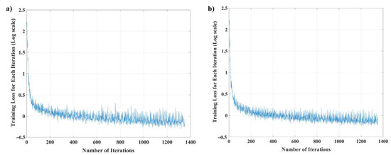Example of loss reduction curve (log scale) during the training process at 50 max epochs, mini-batch size at 8, and initial learning rate at 10−5. (a) Training loss and the number of iterations for original image dataset, (b) training loss and the number of iterations for background removal dataset.