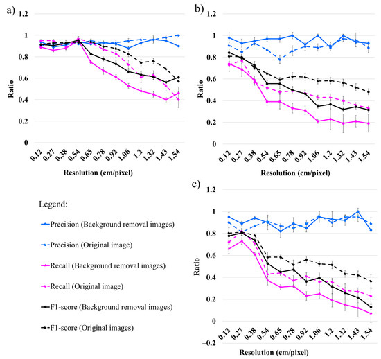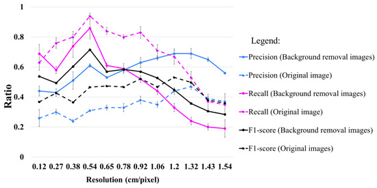 The detection results at the three designed sites were measured as the mean values and are illustrated in Figure 7 via indices of precision, recall, and F1-score. The mean precision at all designed sites fluctuated between 0.8 and 1, especially that of designed site 1, which remained at approximately 0.9 as the location of the training data source. These good ratios may be due to the segmentation step’s effect in the object detection process (Section 2.4). The mean recall and mean F1-score values of the original images were higher than those of the background removal images at most resolutions; this showed a better performance of the original images at each site. Considerably, both recall and F1-score had a downward trend by 0.57 and 0.39 at designed site 1, by 0.55 and 0.52 at designed site 2, and by 0.66 and 0.67 at designed site 3, respectively, and a significant decrease by over 0.3 in both those indices of designed site 2 and designed site 3 compared to designed site 1, indicating the influences of environmental factors and sample conditions on the detection performance.