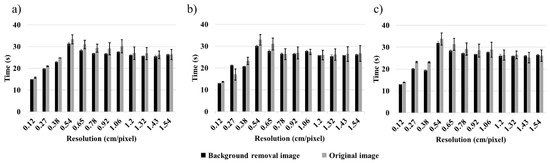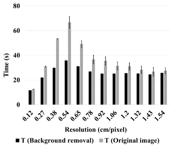 Furthermore, background removal images perform better in the testing site, particularly from 0.12 to 0.65 cm/pixel resolution (Figure 9). The precision values of the background removal images are larger by approximately 0.23 and 0.05 than those of the original images, while their F1-scores are greater by at least 0.06. Remarkably, background removal images obtain a local peak at 0.54 cm/pixel resolution, and the occurrence ratios of mean precision, recall rate, and F1-score are 0.61, 0.86, and 0.72, respectively. Comparing the range of recommended resolution (0.3 to 0.5 cm/pixel), which is described in Section 3.2, we selected approximately 0.5 cm/pixel as a highly suggestive resolution for aerial surveys related to BMD research. Background removal images also dominate in processing time at all resolutions, and they are faster from 0.88 to 31 s (Figure 10).
