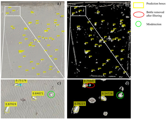 Example of noise and FP on images with and without background removal at the testing site. Detection result on the original image (a) and background removal image (b) at 0.54 cm/pixel resolution are marked as yellow boundary box, while (c,d) are, respectively, the closed view sight corresponding to the white areas in the two above. These zoomed views indicate that some objects, particularly footprints, wooden sticks, styrofoam boxes, and shadows, were mistakenly identified as BMD.