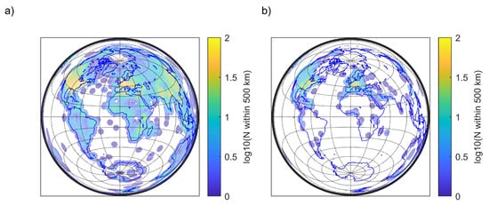Global coverage of vertical atmospheric in situ measurements and their densities (logarithm with the base of 10 as the number of stations within 500 km) on a world map (Lambert Azimuthal Equal-Area Projection). In panel (a), the data from the Integrated Global Radiosonde Archive (IGRA) Version 2 stations [2] are shown, revealing areas with low densities over the oceans. In panel (b), vertical profiles of AMDAR measurements are shown (source [3]), revealing low densities over the oceans and Asia, and generally in the southern hemisphere.