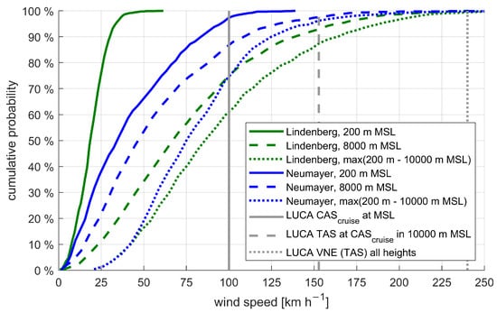 Cumulative probability function of wind speeds calculated of the observed conditions at the Lindenberg and Neumayer Station sites for the time period 2016–2018. The green lines represent Lindenberg (Germany), the blue lines Neumayer (Antarctica). The solid lines describe the wind speed probability close to the ground. The dashed lines denote the wind speed distribution at 8 km altitude. Evidence of jet streams are visible for Lindenberg, whereas the wind speed at Neumayer is relatively moderate at this altitude. The dotted lines represent the probability of the maximum wind speed at a time for the atmospheric column between 200 m AMSL up to 10 km AMSL. Again, higher wind speeds caused by jet streams are observed for the Lindenberg site. The gray lines (solid, dashed and dotted) denote design parameters of the UAS LUCA and are discussed in Section 3.1.2.
