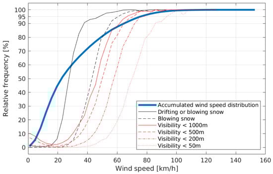 In regions with loose soil (e.g., sand and snow), high wind speeds at the ground level reduce visibility. This is the case for the site Neumayer [31], and is graphically presented in Figure 3 for ground based measurements. Low wind speed visibility reduction is typically caused by fog or snowfall, while high wind speed visibility reduction is typically caused by blowing snow and possibly snowfall.