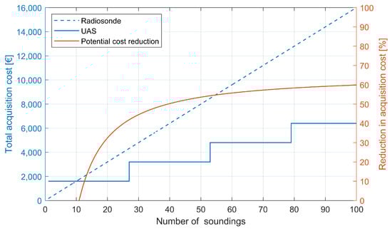 Assuming acquisition costs of EUR 160 per radiosonde and EUR 1600 for a reusable UAS, the resulting total costs are shown in Figure 4 as a function of the number of soundings. The potential reduction in the total acquisition is shown under the assumption that the UAS may be used for 25 flights before a replacement is needed.