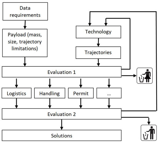 Methodology to converge ideas into a feasible solution space. Subsequent to the generation of requirements, the solution space is iterated and sorted out by the first evaluation in a technical feasibility loop. The remaining solutions are then evaluated against soft and disruptive demands, such as logistics, handling, and permission. Since technology evolves and demands might change, the process has to be applied dynamically in time and solutions have to be reevaluated frequently for future potential UAS deployment.