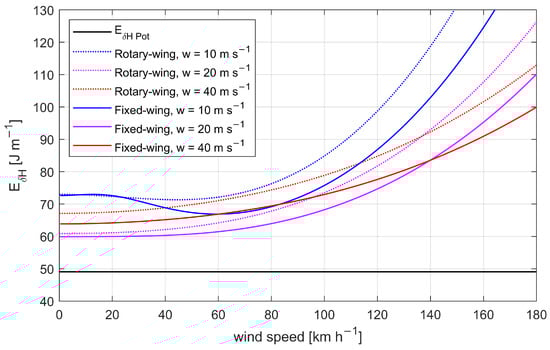 Energy consumption per height unit for a rotary wing and a fixed-wing system for wind speed from 0 km h to 160 km h, which is assumed to equal the horizontal true airspeed component, and climb rates of m s. As a reference, the potential energy increase per height unit is shown. Thrust efficiency was neglected for the calculations, but might be applied as a linear coefficient on the results to calculate more realistic energy consumption.
