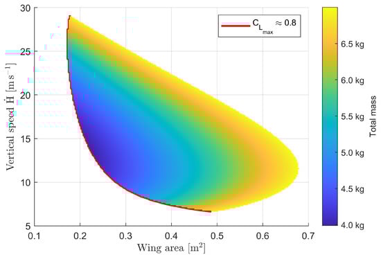 Figure 7 gives some important insights into the resulting design. The minimum in the mass is reached for small wing areas, and as mass is decreasing less than the wing area towards the left side of the calculated field, the wing loading increases toward small wing areas. Subsequently, this yields to the high overall lift coefficient, which has to be considered during the aircraft design, also characterized by the boundary of the resulting field. The mass minimum depending on vertical speed indicates a distinct minimal mass around 12 m s with a gradient increasing towards higher wing areas. The field is only limited by the maximum total mass (criterion kg, upper and right boundary) and the maximum overall lift coefficient (, lower and left boundary.