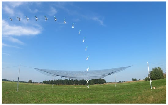 As the developed UAS, which is a fixed-wing small UAS representing the MASE (medium altitude, short endurance) class [60], is intended to be used in low visibility conditions and during the night, automated launch and recovery systems have been developed. While the automated launch consists of a spring-loaded catapult, the “splashdown”-concept is set up as a vertical dive into a horizontal net, where the UAS is supposed to rest until it is retrieved by the operational staff.
