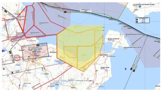 Map of the region where flight tests up to 10 km were conducted. The restricted areas ED-R10 (emphasized in light yellow) enveloped the operational volume, and the Baltic Sea below the airspace was secured by two military boats. The map center is at 54.5° N and 10.7° E. Map source [56].