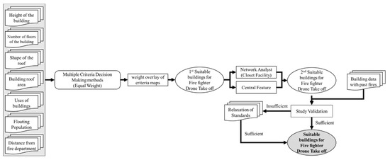 As such, in selecting take-off sites on ground surfaces, various problems may arise, including the difficulty of ensuring safety due to traffic control for drone operation with respect to vehicles. The selection of take-off sites on open surfaces in this way also entails vulnerability in managerial perspectives so that a case may arise in an actual disaster incidence where the landing at the selected site is impossible. Thus, this study focuses on flat-roof buildings in lieu of ground surfaces with various potential problems while applying a geographic information system (GIS)-based multi-criteria decision-making (MCDM) method.
