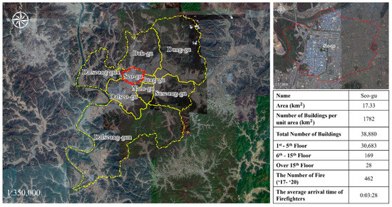 Daegu metropolitan city (Daegu-si) is divided into eight administrative districts with approximately 884 km2 of total area. As of 2020, the total number of inhabitants was 2.24 million, with a population density of approximately 2533 persons/km2. The Building Registry from the Ministry of Land, Infrastructure, and Transport reveals that the total number of buildings in Daegu-si, as of December 2021, was 235,969, excluding the buildings with missing data on the number of building floors. The target area in this study was set as Seo-gu in Daegu-si. Seo-gu has the second-highest number of buildings per unit area. Compared to Jung-gu, with the highest number of buildings per unit area, Seo-gu has a complex mixture of buildings with a varying number of floors. According to fire incidences reported in Daegu-si from 2017 to 2020, the number of fire incidents in Seo-gu was 462, close to the average. Table 2 shows the current status of buildings in Daegu-si and Figure 3 shows the current status of the study site.