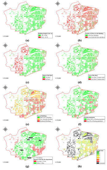 Suitability of drone take-off and landing sites by each: (a) Height of the building; (b) Number of floors; (c) Shape of the roof; (d) Area of the roof; (e) Uses of the building; (f) Floating population; (g) Distance from the fire department; (h) Weight sum.