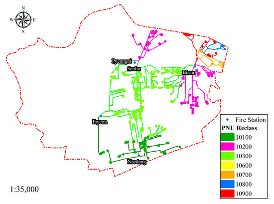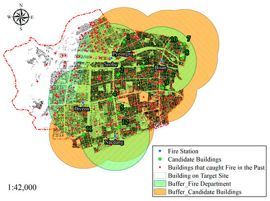 The PNU-based grouping of buildings for the selection of candidates and the analysis of the distance from fire departments.