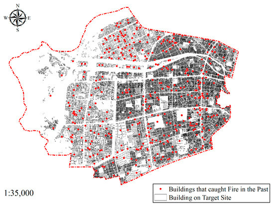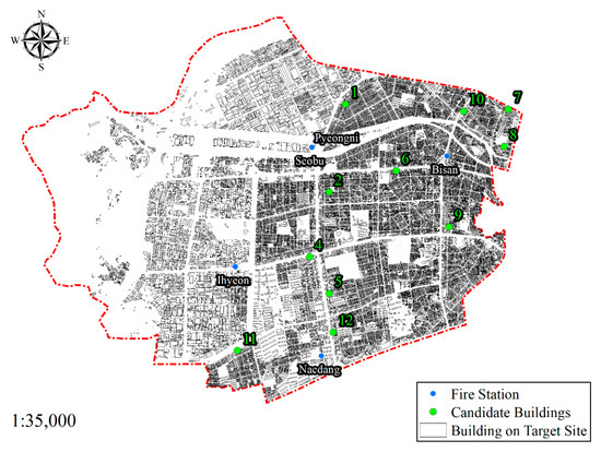 As shown in Figure 2, in this study, we selected 7 criteria, based on which the GIS-based MCDM method was applied to identify suitable sites. The equal-weights method was used to estimate the weight of each criterion. The layer of each criterion was summed up, considering the constraint criteria, such as roof instead of flat roof and fire-vulnerable buildings. The data of buildings that satisfy all seven criteria were extracted, and the buildings were grouped based on their geographical location. Through network and central feature analyses, the grouped buildings and the distance from the fire department were analyzed. Then, the building located at the center of the grouped buildings was selected. The data of buildings with a past fire incidence in the target area were used in the validation.
