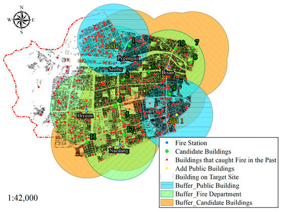 Figure 10 shows the scope of fire responses after performing the complementation via the relaxation of standards. The added candidate buildings allowed the response to 211 sites of buildings with a fire incident. The overall rate of fire response in the target area was 95% for buildings at 442 sites.