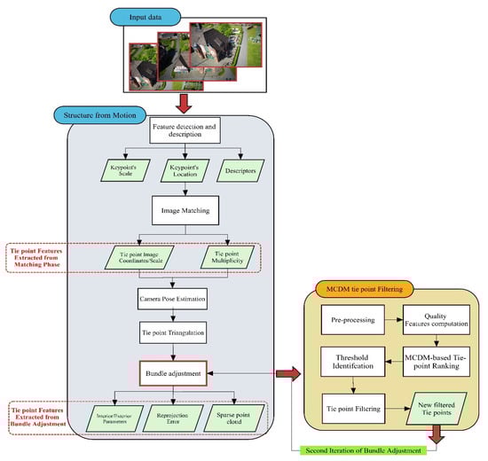 The proposed method begins with the well-known process of SfM, within which the quality parameters for each tie point are firstly computed. Then, a MCDM method is used to aggregate the quality measures and create a competency score for each 3D tie point. These competency scores are then employed in an automatic filtering process to discard low-quality points before running a new bundle adjustment to refine the results. Since our method acts as an intermediate step in the whole SfM pipeline, it can be embedded into any SfM application. The details are described in the following sections.