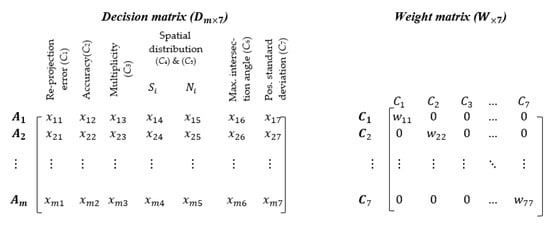 The decision matrix (D) and weight matrix of the MCDM problem characterized by m tie points and six quality criteria.