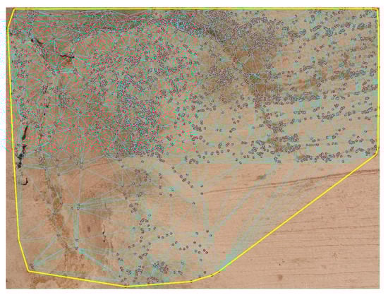 Furthermore, Giang et al. [] proposed a method-called SIROP, which aims to enhance the accuracy of image orientation by adding a spatial filtering step to the second iteration of photogrammetric processing. In their method, new tie-points are selected based on three quality metrics: correlation, multiplicity and spatial distribution. First, a Global Correlation Score is computed for each tie-point based on the first two criteria. Then, to assure the homogenous spatial distribution of selected points, the neighbour tie points with a low correlation score are filtered. Later, Barba et al. [] proposed a two-step filtering strategy which analyses two quality measures of re-projection error and the intersection angles. The filtering method consists of an outlier detection at the first step which considers the statistical distribution of re-projection errors to compute a threshold to remove points. In the next step, a noise reduction procedure removes points with small intersection angles.