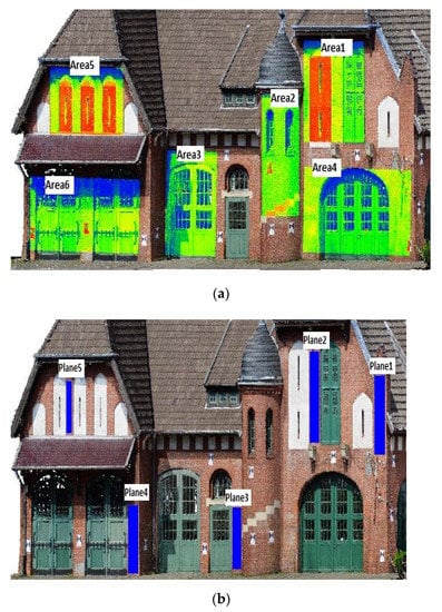 Furthermore, as shown in Table 12, the plane fitting analysis using six selected areas on dense cloud (Figure 10b), indicated an average MAE of 26.584 mm, STD of 20.491 mm and RMSE of 33.653 mm for the original point cloud data. Moreover, for the Farella filtering algorithm, the amount of MAE, STD and RMSE were calculated as 11.364 mm, 9.577 mm and 14.879 mm, respectively. However, our algorithm revealed a lower level of noise for the acquired dense point cloud with MAE, STD and RMSE of 7.037 mm, 5.192 mm and 8.573 mm, respectively.