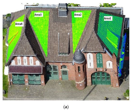 In addition, four sub-areas (Figure 10a) on the generated point clouds were selected, and the results of the cloud-to-cloud distance in these areas are computed. The average STD and RMSE of the original point cloud data, as shown in Table 11, were 56.37 mm and 47.66 mm, respectively. These values were calculated to be 33.67 mm and 37.62 mm for the filtered point cloud of Farella method and 13.702 mm and 11.055 mm for our method. These values indicated that our filtering algorithm performs effectively in generating accurate 3D models.