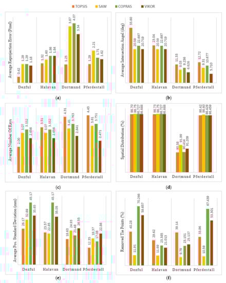 As Figure 11e shows, the average posteriori standard deviation of the 3D points for the TOPSIS algorithm with an average of 20.18 mm is the lowest in all datasets. For Dezful and Halavan datasets, COPRAS has the weakest performance with an average deviation of 45.17 mm; for the Dortmund and Pferdestall datasets, VIKOR has the lowest performance with a standard deviation of 24.70 mm.